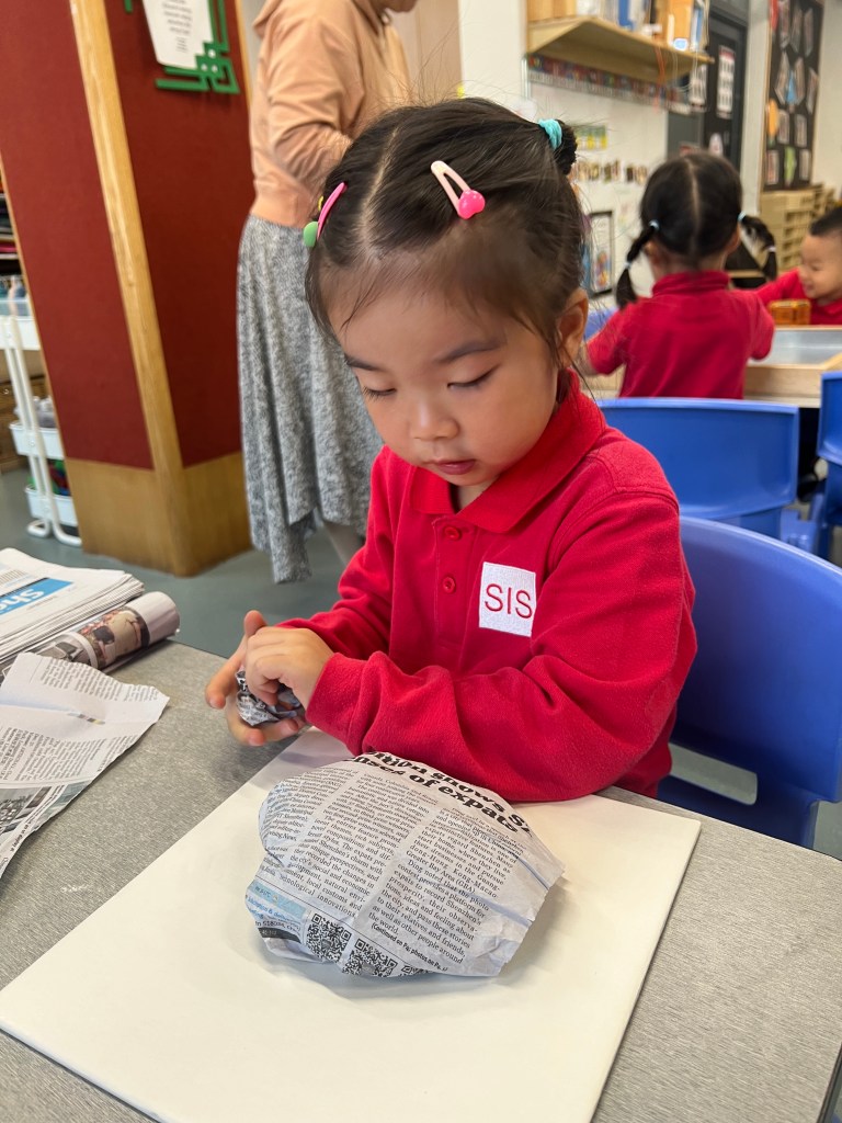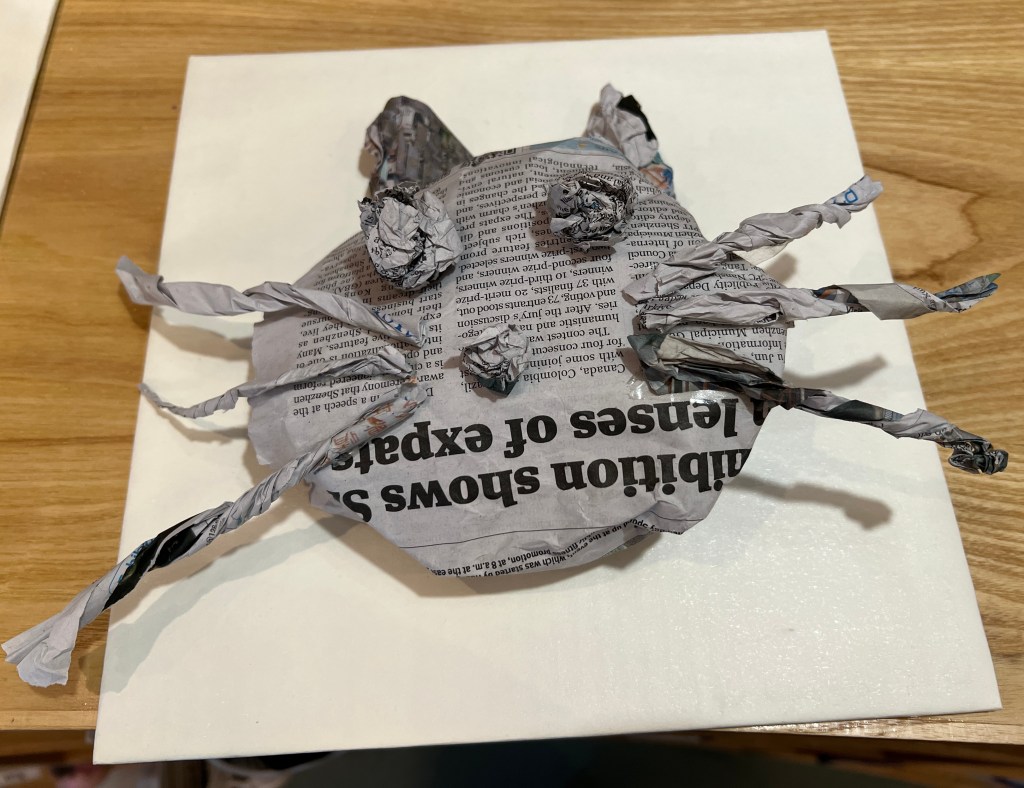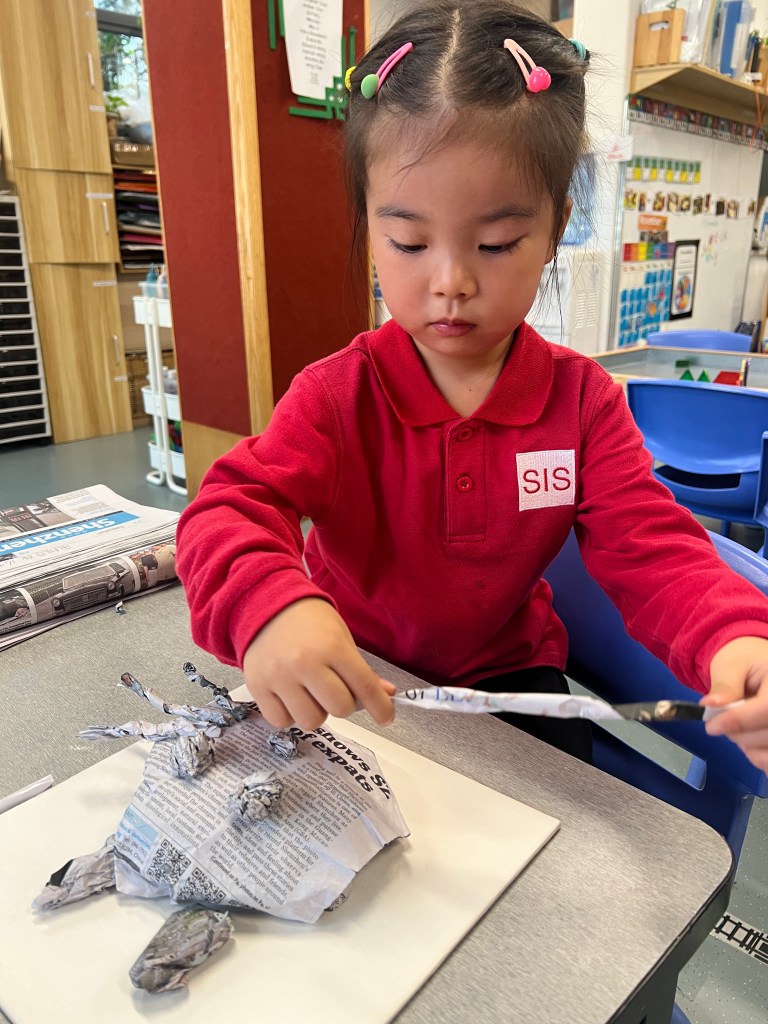 This composition was later transferred to a 3D project. We are using old newspapers to make the 3D shapes and bring our creations to some kind of sculpture design. We will ask the children if they want to paint it using different colors or perhaps just painting the background with black. Come back for more details later on!